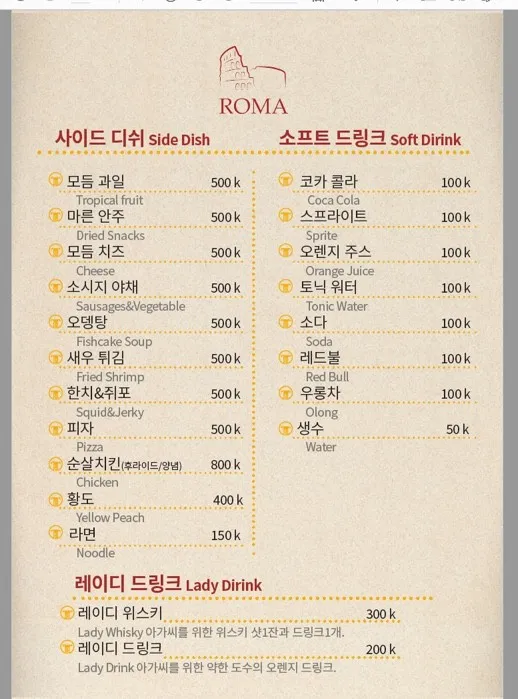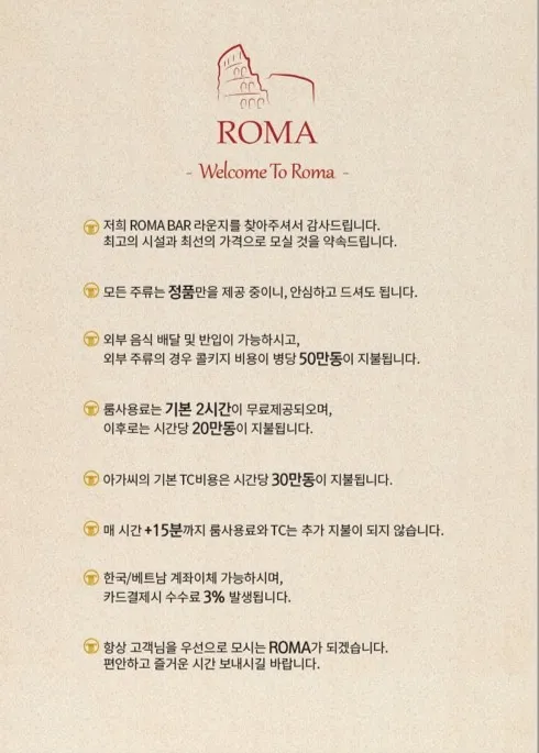 착석비 : 1시간 25만동 (매우 저렴한 편!) 룸비 없음 / TAX 없음 → 가격 구조가 매우 투명함