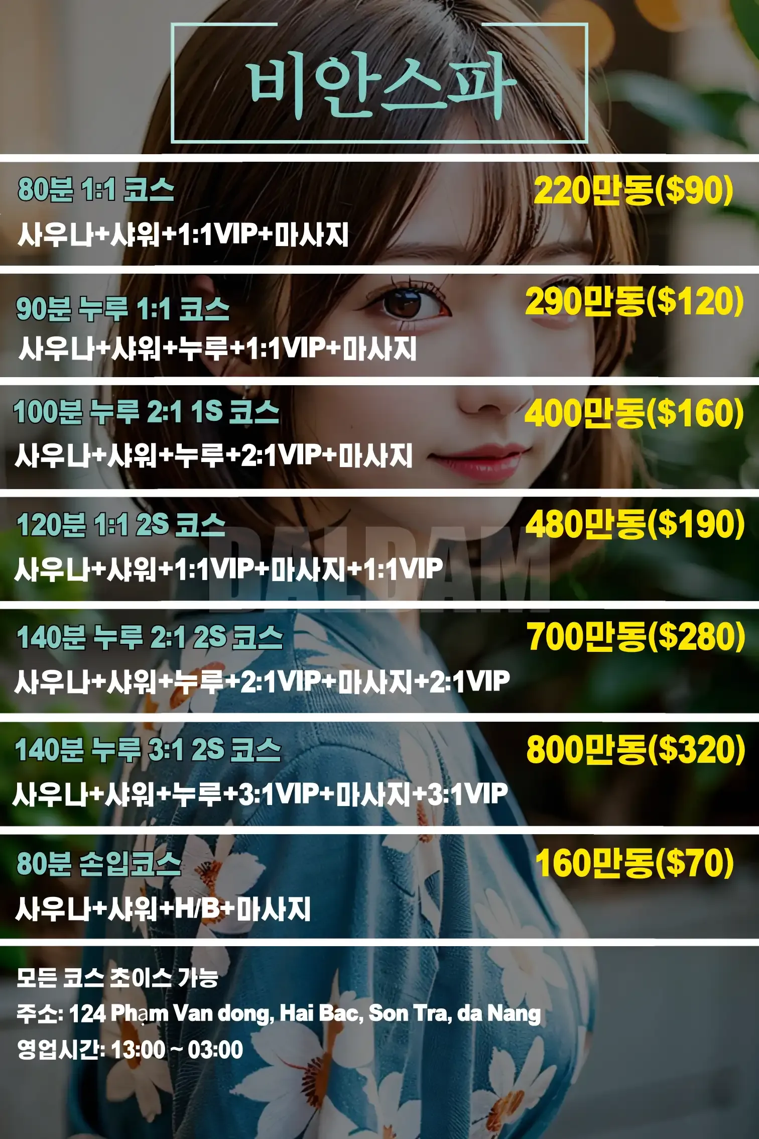다낭의 대표 유흥 거리인 팜반동(Phạm Văn Đồng) 중심부에 위치한 다낭 비안 VIP 마사지 (Danang Bien VIP Massage)는 깔끔한 시설과 완성도 높은 서비스로 여행객들 사이에서 빠르게 입소문을 타고 있는 고급 프라이빗 마사지샵입니다. 호텔 2층에 자리한 이곳은 늦은 밤까지 운영되어 야간 비행기로 도착한 손님들도 편안히 이용할 수 있는 점이 가장 큰 장점입니다.