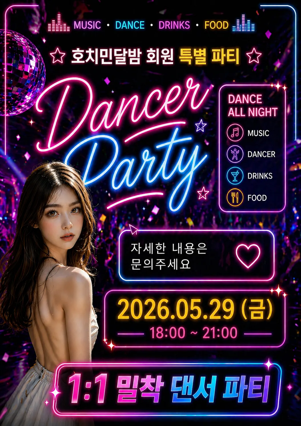 안녕하세요, 호치민 달밤입니다.회원님들의 즐거움을 한층 더 높여드리기 위해 특별한 1:1 밀착 댄서 파티를 준비했습니다. 일시: 2026년 5월 29...
