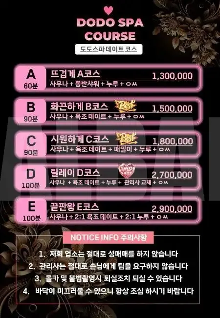 도도 스파의 코스는 A코스부터 E코스 까지 있으며, 고객의 취향과 목적에 따라 선택할 수 있습니다.