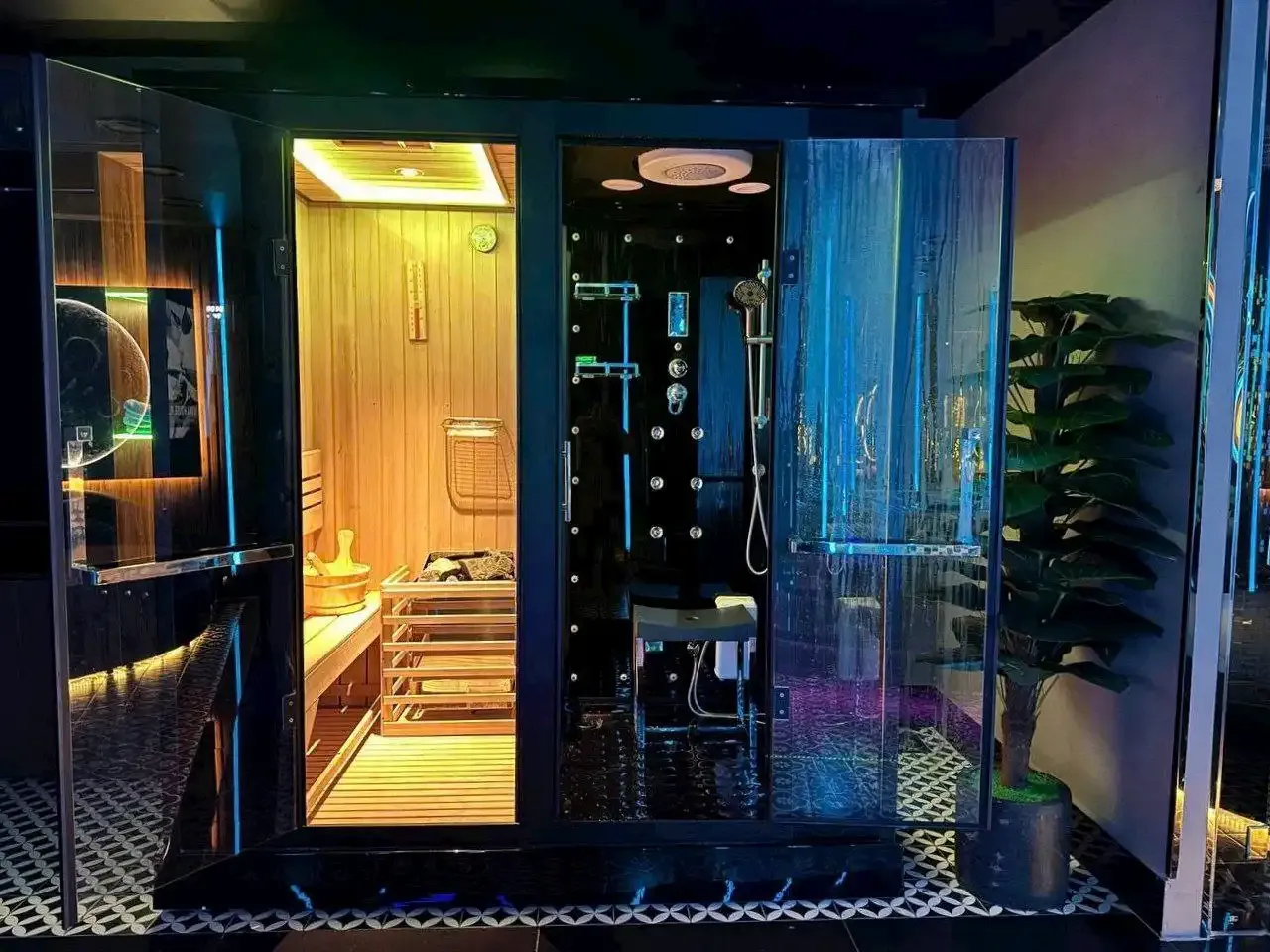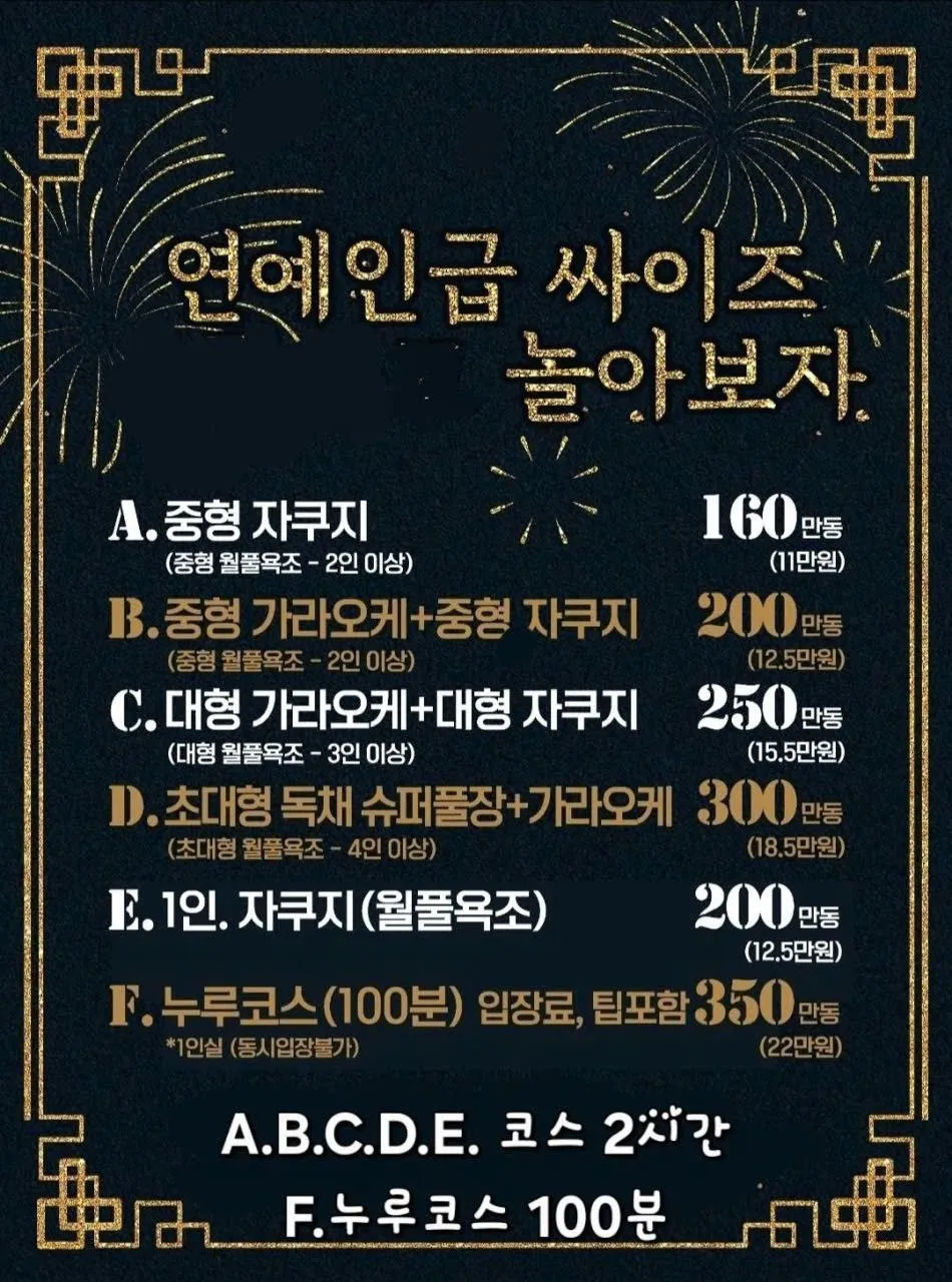 한 공간 안에 가라오케 시설 프라이빗 룸 대형 풀장 & 월풀 욕조 사우나 & 샤워존 이 모두가 함께 구성되어 있습니다.
