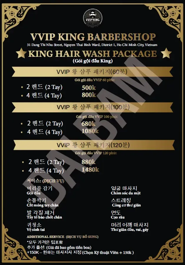 VVIP KING 이발소는 예약제로 운영되는 편이므로, 방문 전 미리 예약하시면 더욱 편안하게 이용하실 수 있습니다. 호치민 1군에서 깔끔한 시설과 안정적인 이발·프리미엄 힐링 케어 서비스를 찾고 계신다면 한 번쯤 방문해볼 만한 이발소입니다.