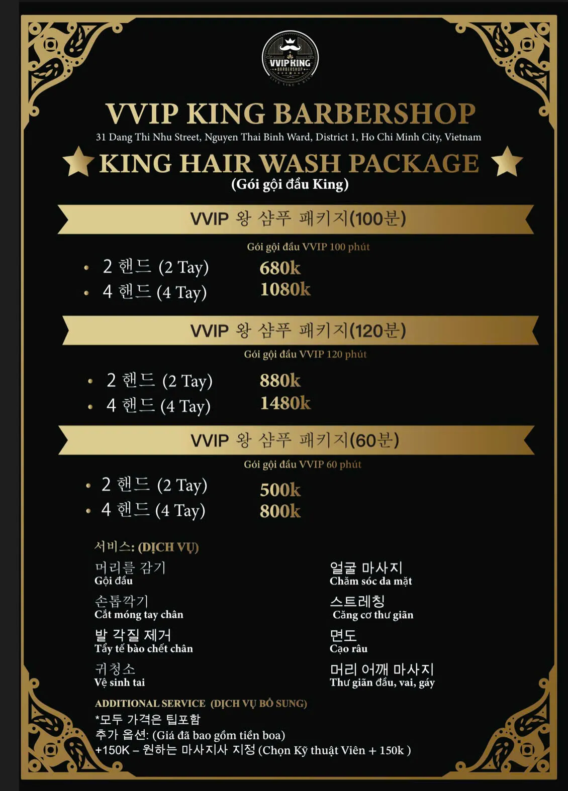 VVIP KING 이발소는 예약제로 운영되는 편이므로, 방문 전 미리 예약하시면 더욱 편안하게 이용하실 수 있습니다. 호치민 1군에서 깔끔한 시설과 안정적인 이발·프리미엄 힐링 케어 서비스를 찾고 계신다면 한 번쯤 방문해볼 만한 이발소입니다.