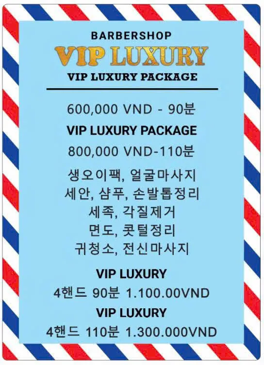 VIP LUXURY Barbershop의 서비스는 그 이름처럼 고급스럽습니다. 마사지, 면도, 세족, 스킨케어 등 기본 코스부터 고객 맞춤형 관리까지 세심하게 제공됩니다. 직원들의 태도 역시 매우 프로페셔널하며, 언제나 미소로 응대하며 고객이 편안하게 머물 수 있도록 돕습니다. 한 번 방문한 고객들은 공통적으로 “서비스가 섬세하다”, “가격이 조금 높지만 그만한 가치가 있다*고 평가합니다.