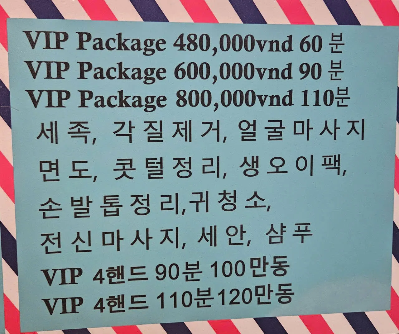 인근 특징: 이발소와 마사지숍이 밀집된 구역 내 위치 벤탄시장 근처라 찾기 어렵지 않으며, 근처 관광 명소와 쇼핑 지역과도 가까워 여행자들에게 접근성이 탁월합니다. 다만 워낙 인기가 많은 곳이라 예약은 필수. 특히 주말과 일요일 늦은 오후에는 예약 없이 방문할 경우 이용이 어려울 정도로 붐빕니다.